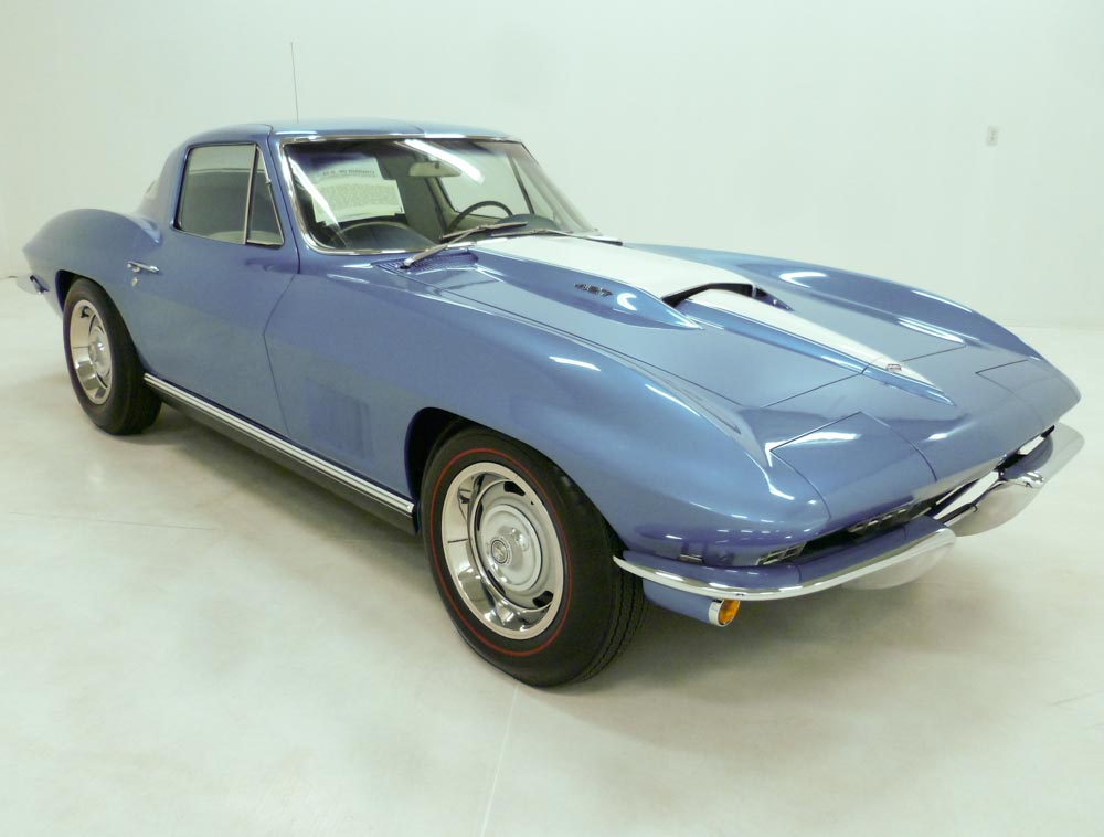1028U..1967 Corvette Duntov Coupe, 427-390 hp, factory air, powerglide, numbers matching original motor, transmission and rear end with CCAS/Grenning Engine Stamp Affirmation. Also has factory original body/trim tag with CCAS Affirmation. Marina Blue paint with White stinger and White/Blue combo interior. Rare and desirable color combination. Body-off restored! Multiple NCRS Top Flight awards (7), NCRS PV'd (Performance Verified), NCRS Duntov Mark of Excellence award, Bloomington Gold certified, and the Vette Fest Triple Crown award. These type restorations normally cost between $150,000.00 to $200,000.00. Optioned with factory air, powerglide, power steering, power brakes, power windows, shoulder harness, positraction, SS brakes, AM/FM radio, tinted glass, rallys, and 7.75x15" red stripe tires. Most all factory correct type components including the spare, jack, jack tools, seat belts, washer system, shifter, shielding, braided wires, air cleaner, alternator, distributor, hoses, hose clamps, window glass, valve covers, starter, carb, exhaust shields, radiator, gas door assembly, glove box door, warranty book, owners manual, sales brochure, and T-3 headlights. Documented with the NCRS/GM validated tank sticker (build sheet), dealer invoice, warranty book/P.O.P., CCAS/Grenning Affirmations, owners manual packet, owner history, NCRS confirmation of Judging awards, judging awards, certificates,and judging sheets. Production date of June 8th, 1967 and delivered new by Steakley Brothers in Dallas, TX. (dealer code 698 in zone 7) per the official NCRS/GM Shipping Data Records (SDR). Also noted is that this car was a factory delivery at the St. Louis Plant for Miss Dana Dayus. Looks, runs, and drives excellent. CC:1 $249,000.00