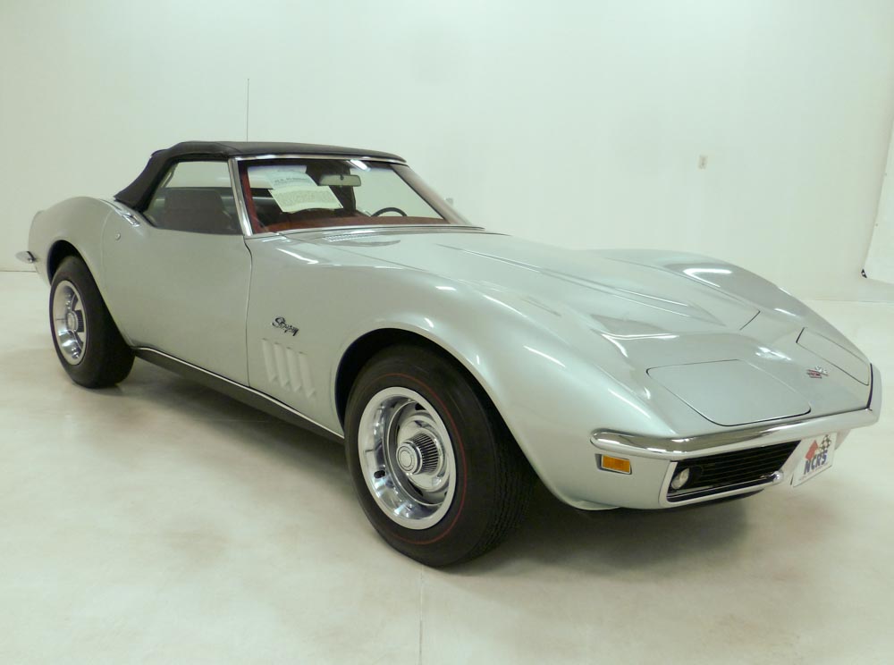 1005W..1969 Corvette Time Capsule Convertible, 350-350 hp, 4-speed, numbers matching motor, transmission and rear end, 802 actual miles. Cortez Silver paint with Red interior and Black soft top. Original unrestored super low-mile time capsule with excellent cosmetics including chassis and engine compartment. NCRS Top Flight award in 2015. These original unmolested cars are among the rarest of rare and are rising to the top of the Corvette food chain as unrestored cars are used as guideposts for restorers, shining a light on the way vehicles were originally built. Super rare color combination with CCAS/Grenning Trim Tag Affirmation. Super low miles!! Optioned with headrests, M-21, 3.70 posi, SS brakes, A.I.R., AM/FM radio, tinted glass, rallys, and red stripe tires. Most all factory correct type components including the spare, jack, jack tools, clear floor mats, shocks, seat belts, washer system, smog system, shifter, shielding, air cleaner, alternator, distributor, spark plug shields, hoses, hose clamps, window glass, valve covers, ball joints, original exhaust, frame stencil, owners manual, sales brochure, and T-3 headlights. Documented with the NCRS Top Flight certificate, judging sheets, CCAS/Grenning Trim Tag Affirmation, owner/mileage history, owners manual, sales brochure and 3-ring binder. Looks, runs, and drives excellent. CC:1/+2 $129,000.00